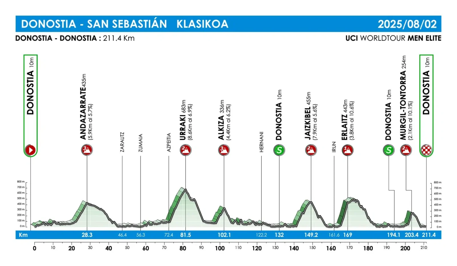 La gara si sviluppa su una distanza totale di 211,4 chilometri, con partenza e arrivo a San Sebastian. La prima asperità sarà la salita dell’Andazzarate, lunga 5,9 km al 5,6% di pendenza media. La corsa si infiammerà successivamente con le salite dell’Urraki, che si estende per 8,6 km al 6,8%, e dell’Alkiza, lunga 4,3 km al 5,9%. Dopo queste ascese ci sarà un tratto più pianeggiante che condurrà verso il segmento decisivo della gara.