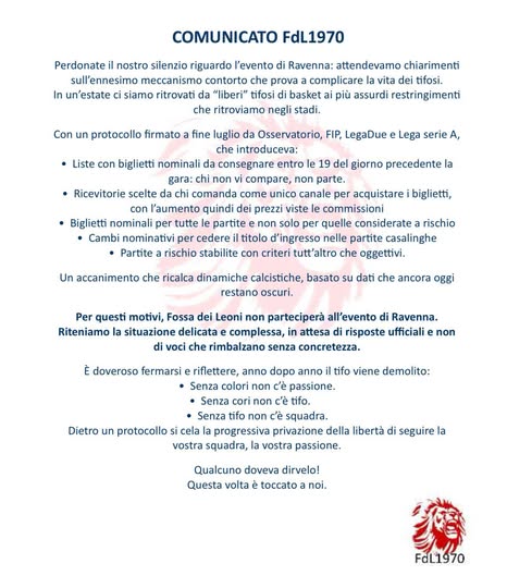 Una recente comunicazione da parte del gruppo Fossa dei Leoni ha annunciato la loro assenza dalla prossima Supercoppa LNP. La scelta nasce da una posizione critica nei confronti delle recenti modifiche normative e delle procedure adottate nel contesto del basket italiano, che vengono percepite come restrittive e penalizzanti per i tifosi.