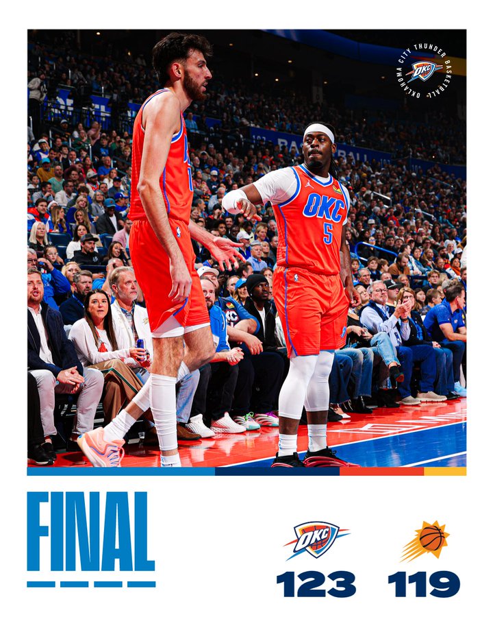 La partita tra Oklahoma City Thunder e Phoenix Suns si è conclusa con un risultato di 123-119. La squadra di Oklahoma City ha conquistato la sua 11ª vittoria consecutiva, consolidando la leadership nel gruppo occidentale, mentre i Suns hanno comunque ottenuto la qualificazione ai quarti di finale. La sfida è stata caratterizzata da prestazioni individuali di spicco, in particolare quella di Shai Gilgeous-Alexander, che ha dimostrato tutta la sua classe.